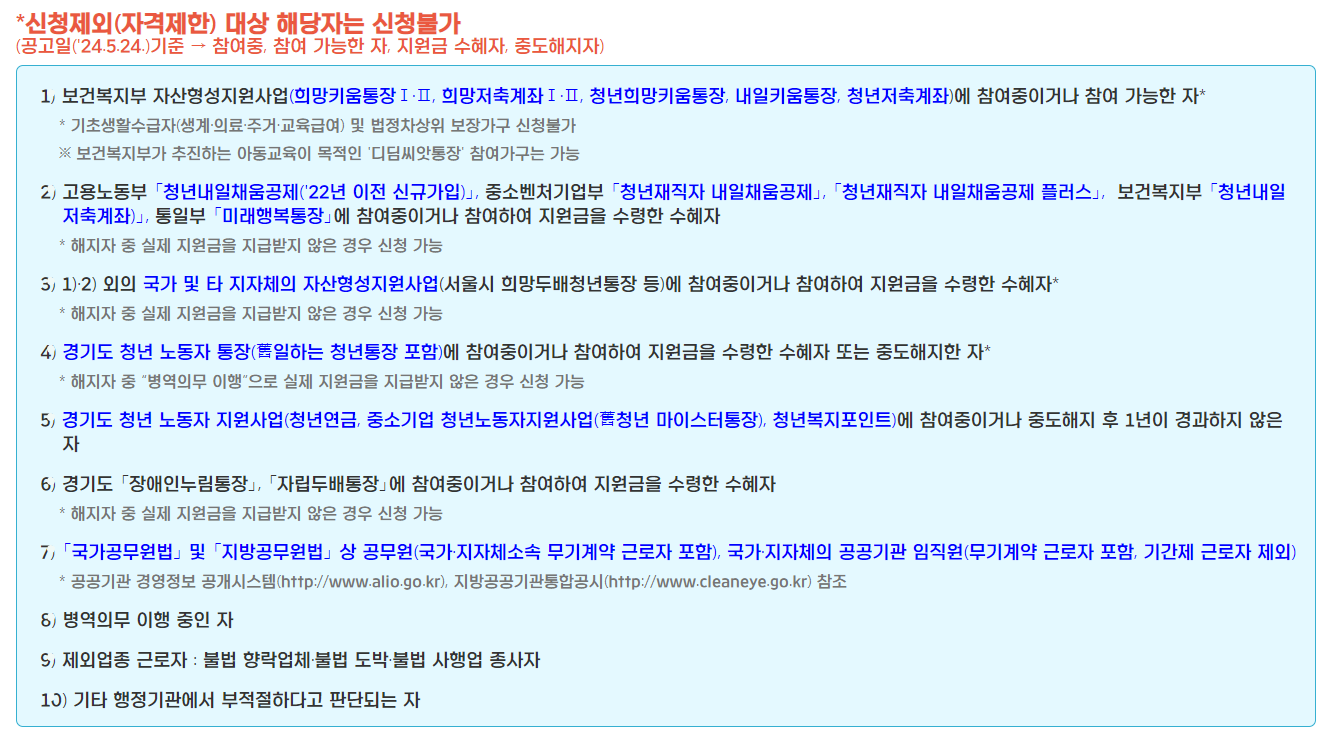 1. 공고일(2024/ 5/24) 주민등록상 거주지가 경기도인 19세이상~39세(1984/5/25~2005/5/24)이하인 대한민국 청년.(병역을 마친 사람은 42세까지 연장됩니다.)