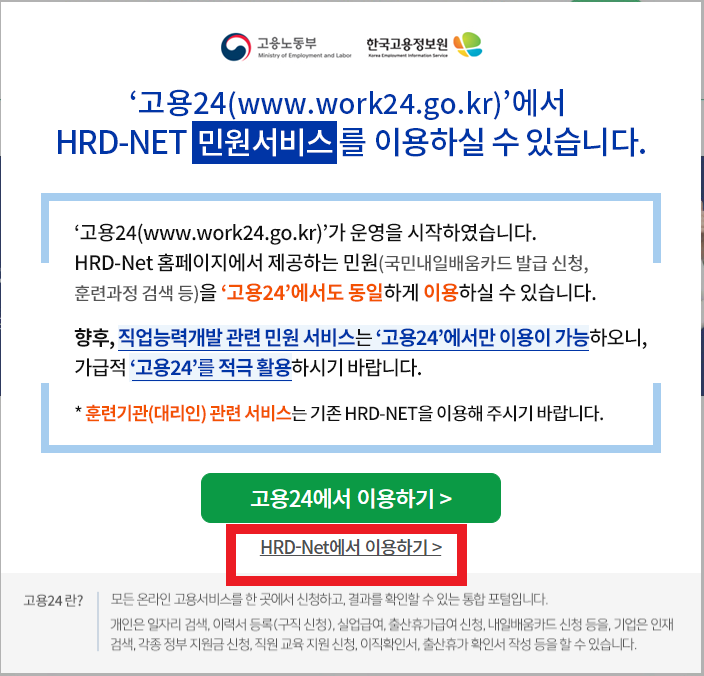 사이트 접속 후 화면에서 HRD-Net을 클릭하시면 직업훈련포털로 넘어갑니다.