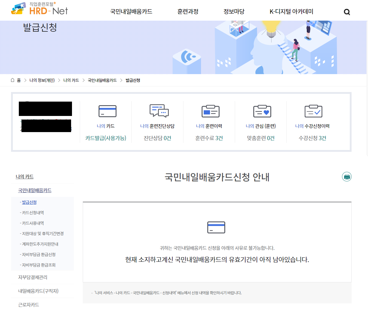 1. HRD-Net 접속 후 국민내일배움카드 발급신청 클릭하십니다.