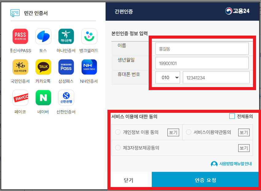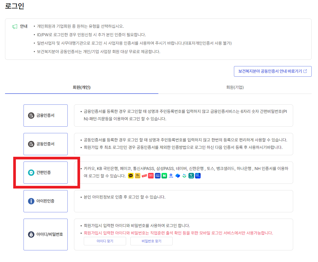 3. 간편 로그인 클릭 하시고 개인정보 입력 후 인증요청, 완료하십니다.