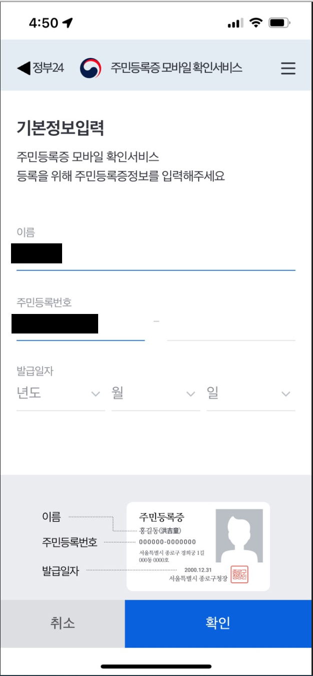기본정보 입력하시고 주민등록증에서 발급일자 확인하시도 입력 후 신청하십니다.