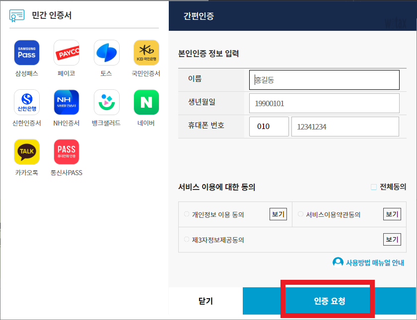 간편 인증 클릭 후 개인정보 입력하시고, 인증요청, 완료하십니다.