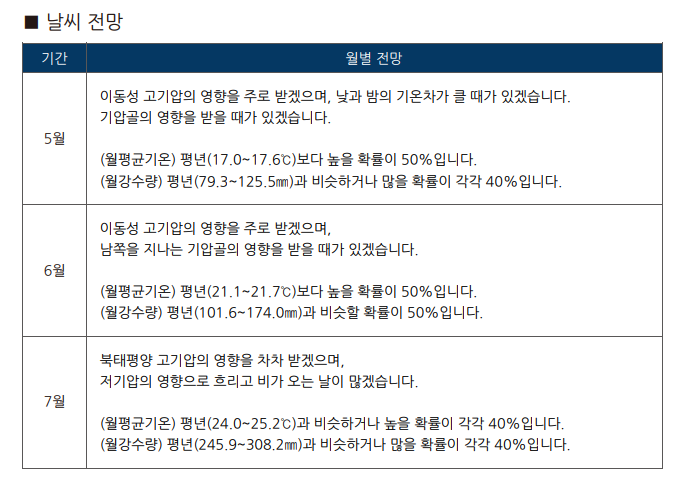 5월, 6월 평년보다 기온이 높을 확률 50%, 7월 평년과 비슷하거나 높을 확률 각각 40%입니다. 강수량 5월, 7월 평년과 비슷하거나 많을 확률 40%, 6월 평년과 비슷할 확률 50%입니다.