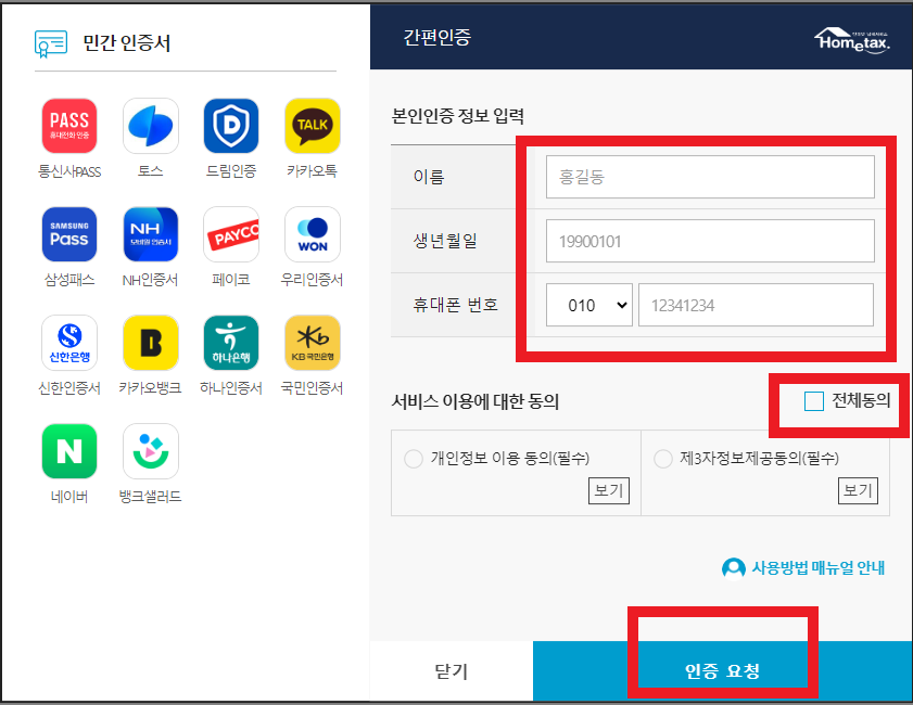 MY 홈택스 클릭하시면 로그인 화면 나옵니다. 간편 인증 선택하시고 개인정보 입력 후 인증 요청, 완료하십니다.